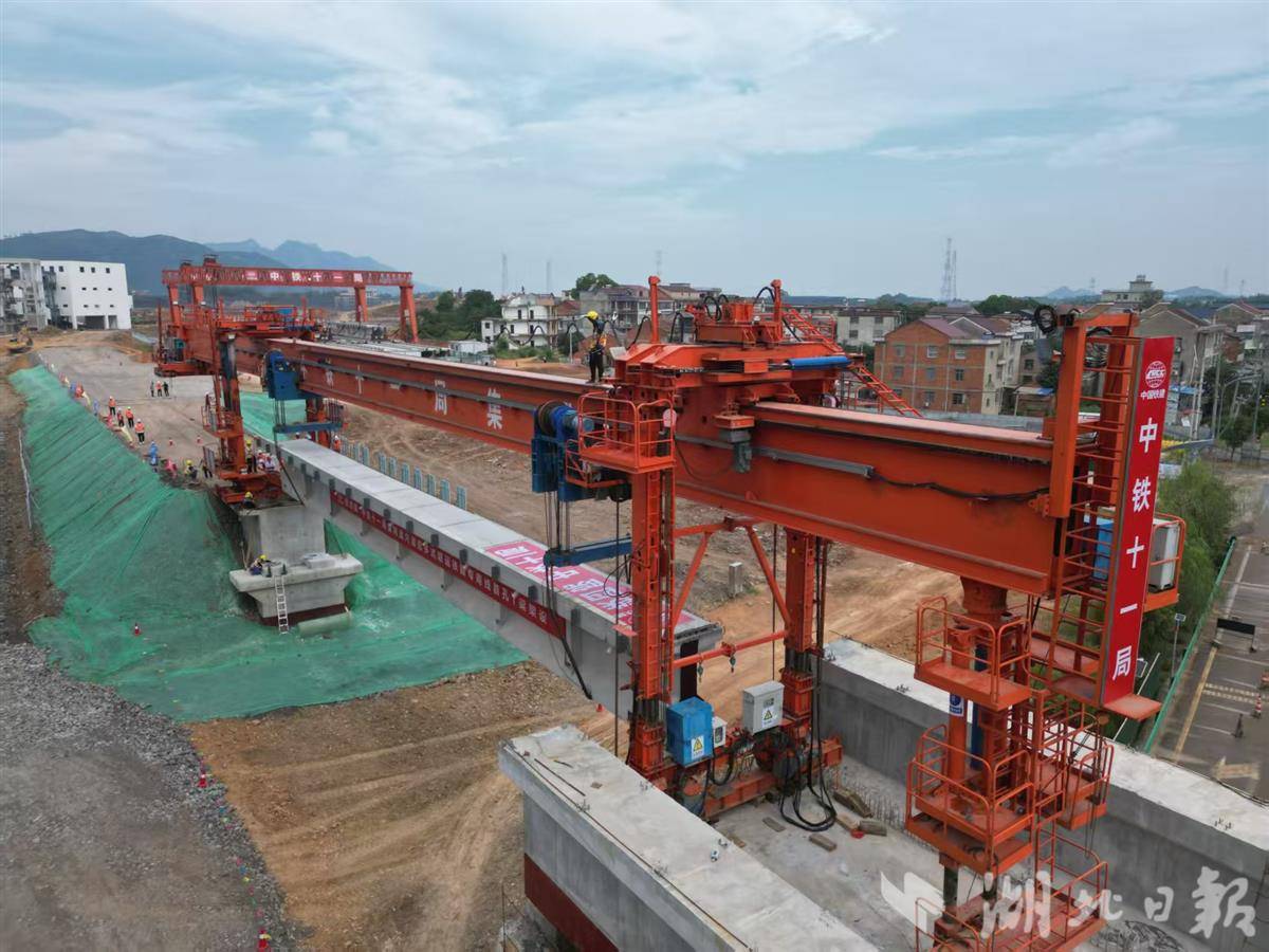 湖北日报讯(记者林晶、通讯员刘连强、实习生于若轩)8月1日上午,在武穴港区多式联运项目架梁施工现场,伴随着架桥机的缓缓移动,一片长32米、重达134.3吨的预制T梁成功架设。这标志着该项目铁路专用线正式开启架梁。