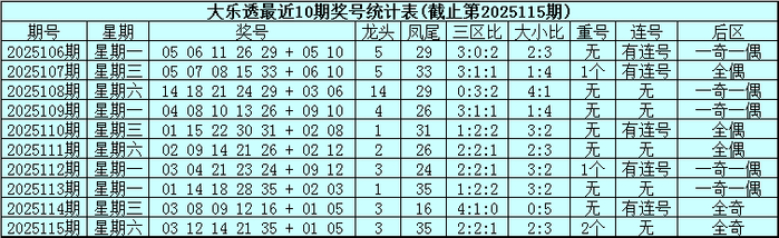 大乐透第2025115期奖号为:03、12、14、21、35+01、05。其中前区三区比为2:2:1,大小比为2:3,包含2个重号,没有出现连号,后区为全奇号码。